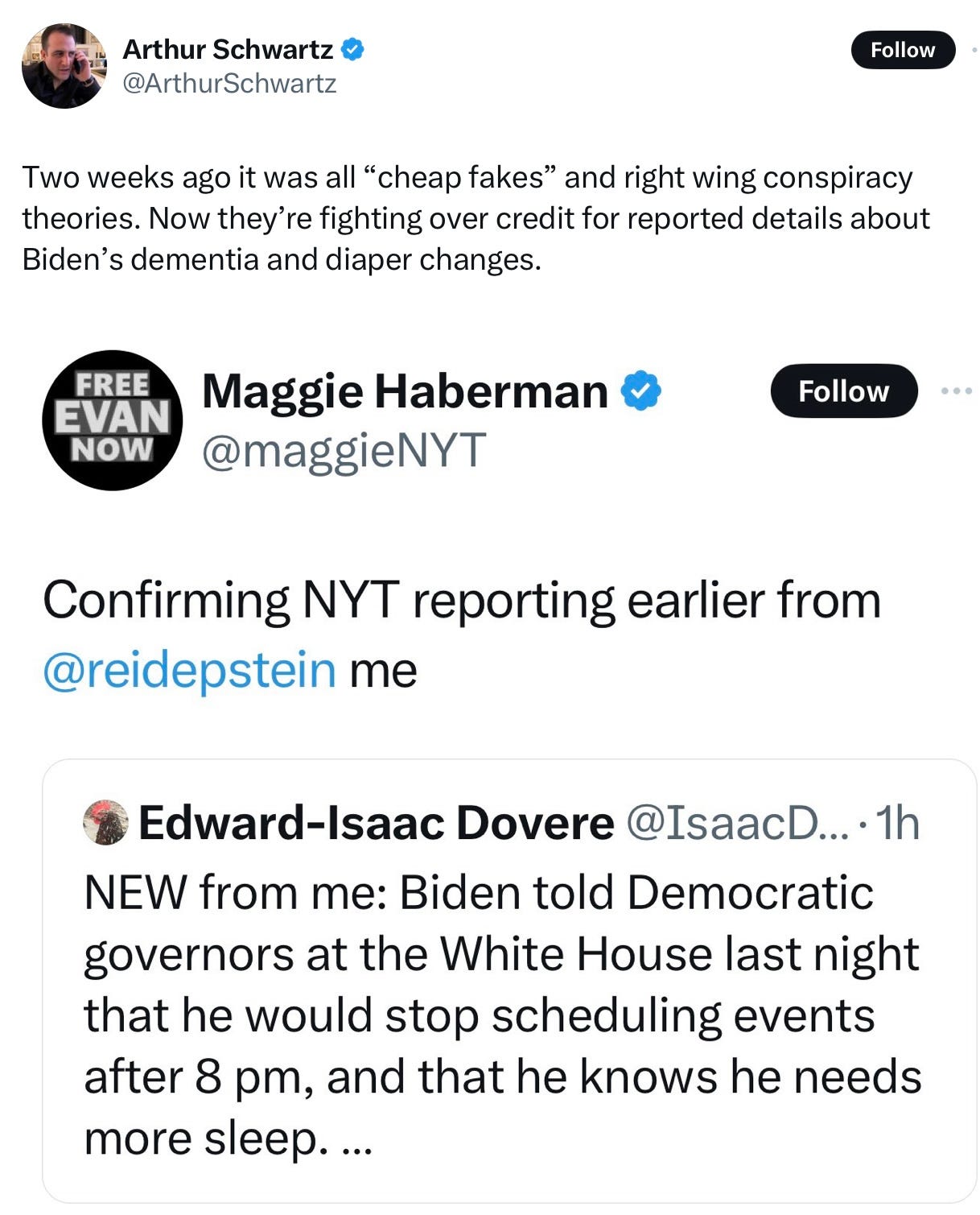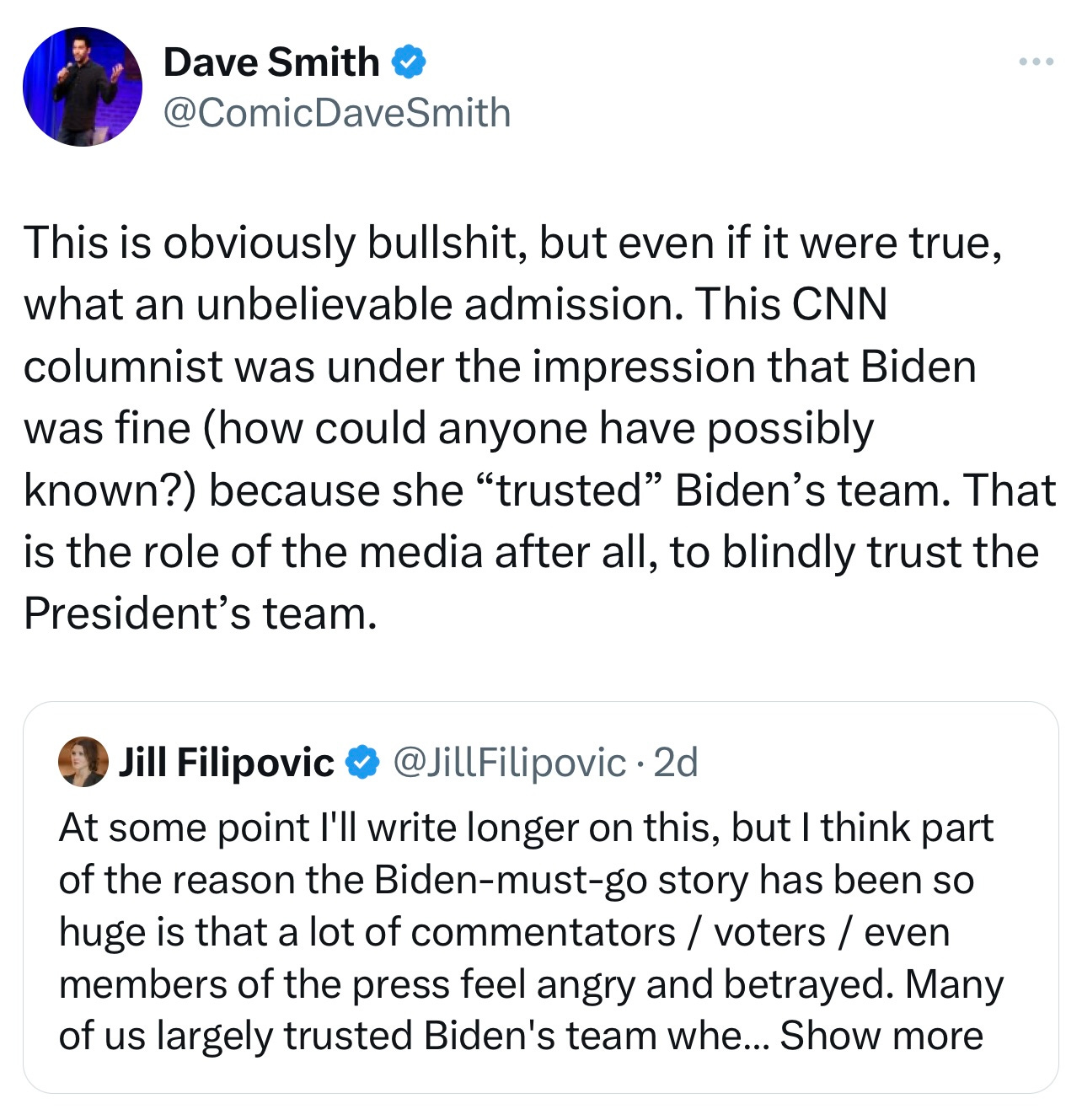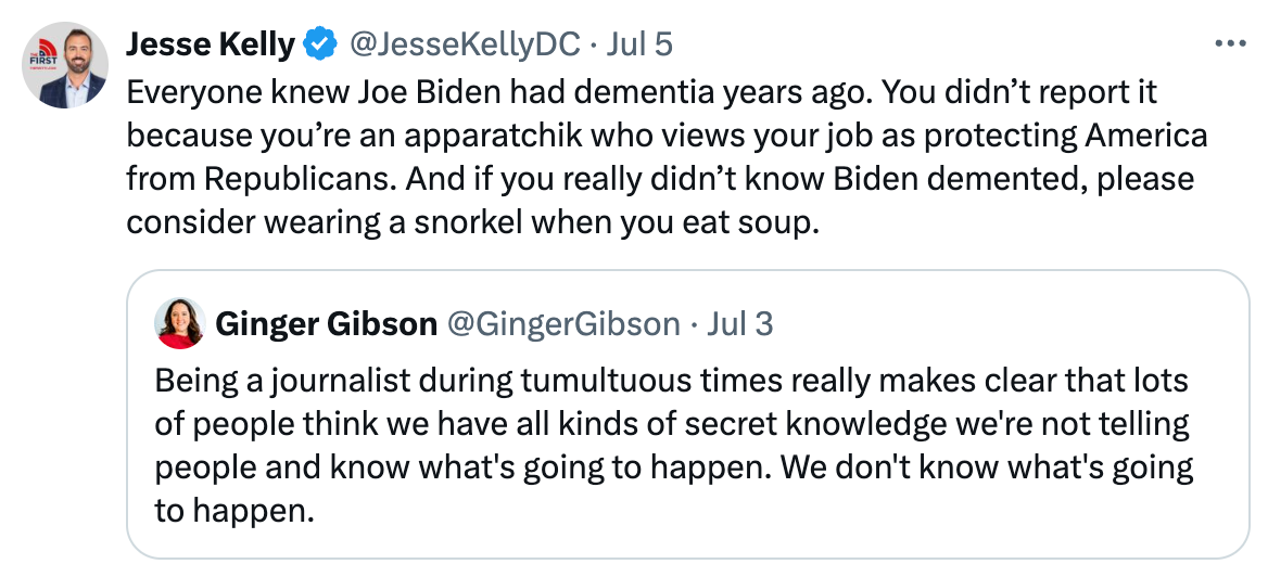 Or more likely, they were operating not as journalists or honest brokers, but as Democratic activists and propagandists doing their best to cover up a massive scandal - that the President was a demented old fool in order to maintain their preferred party’s grip on power.