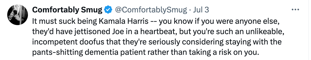 Either option means Kamala is President from TODAY until they select the actual candidate at the Convention, which may in fact end up being Kamala as it’s awfully tough if you’re a party that worships before the DEI God of Wokeness to replace the first Black, Female President (especially with a white male, cough cough Newsom).
