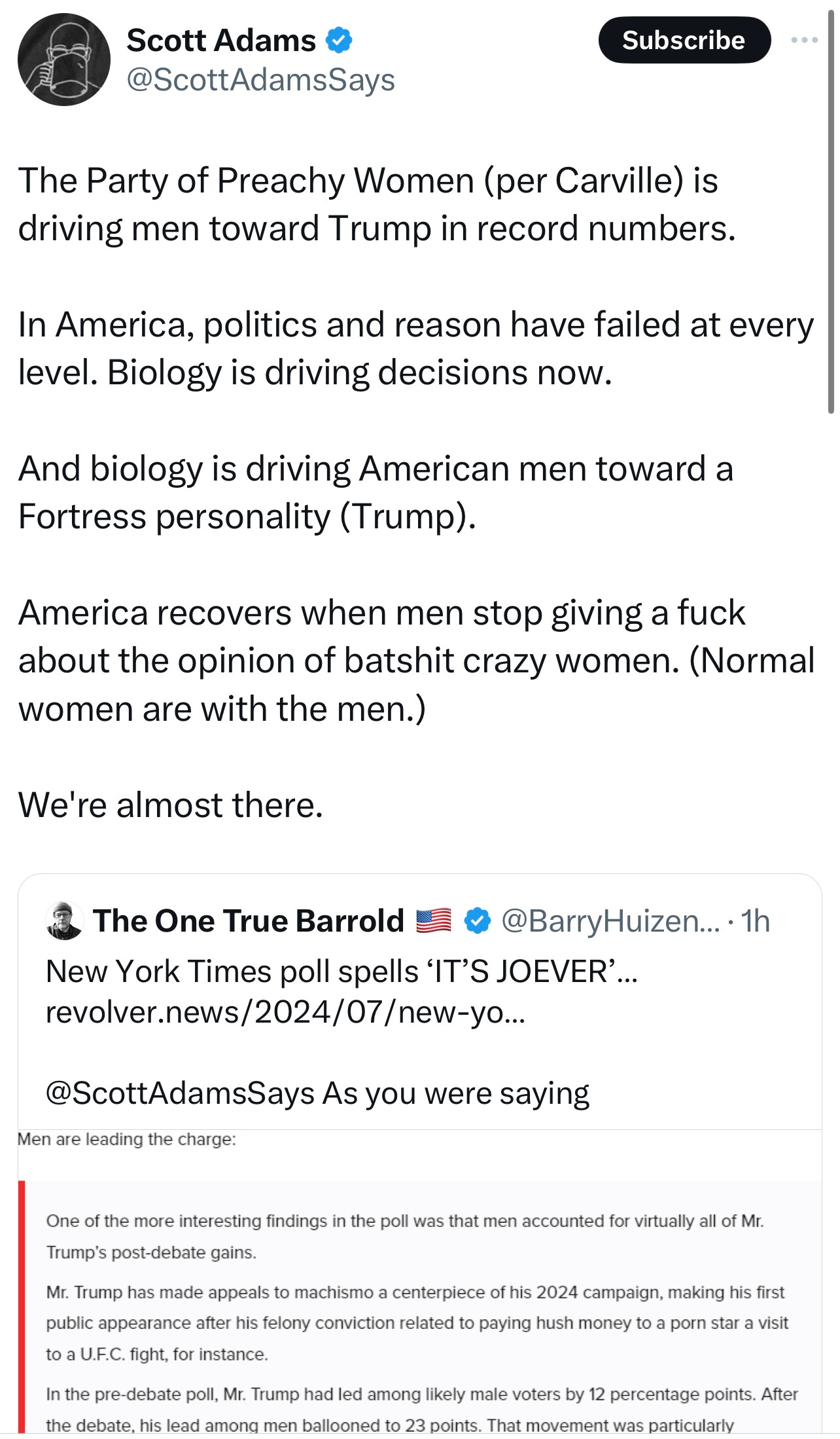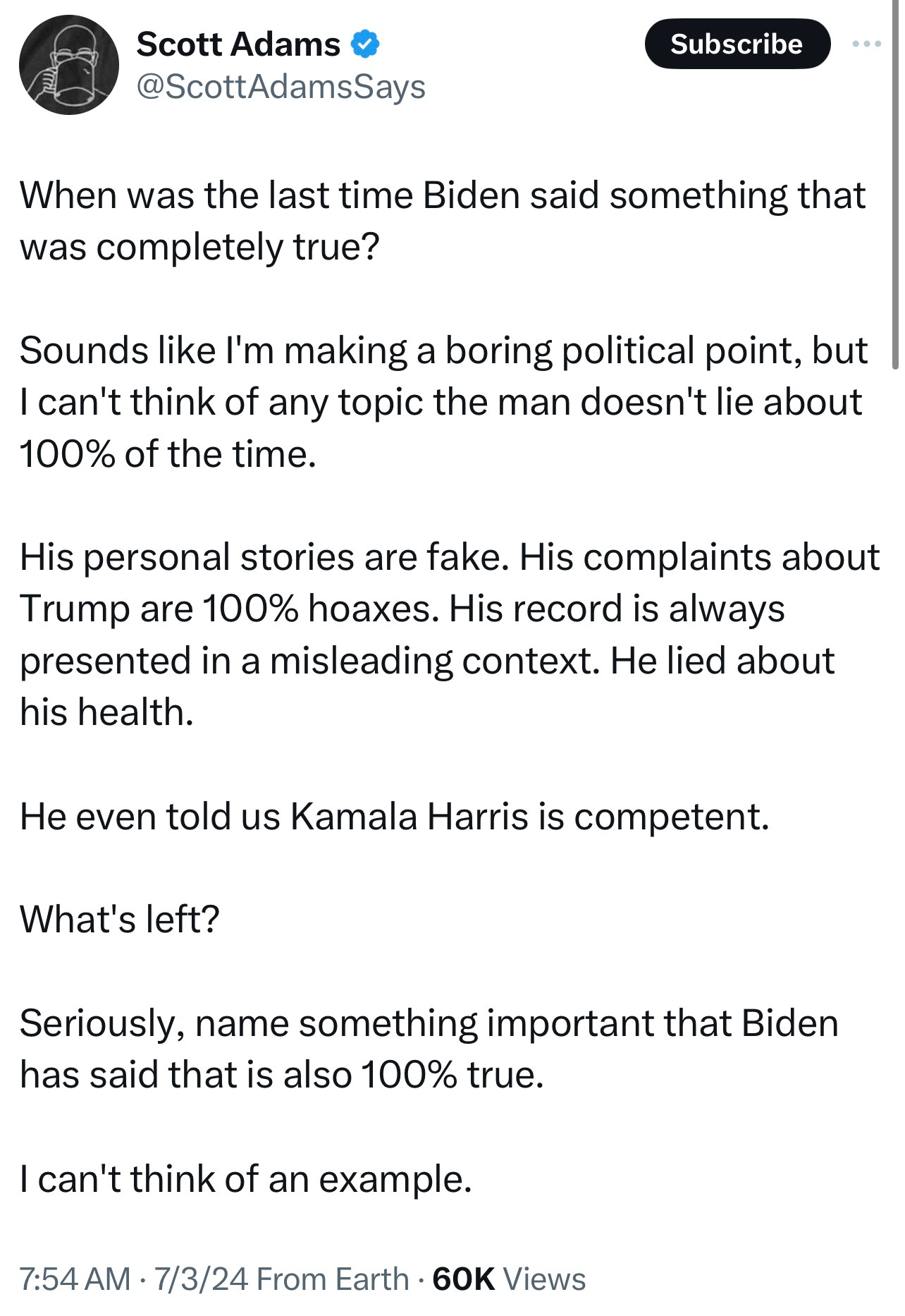 When politicians and journalists can blatantly lie to the face of the American people about the most important things in the world (the deadliness and origin of a novel virus/pandemic and the cognitive fitness of the President and man behind the curtain actually running the country), all bets are off.