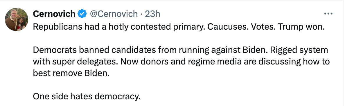 An actual DNC primary would have exposed Biden for the demented nursing home patient he is and there were a half dozen far superior candidates from RFK Jr to Dean Philips available.