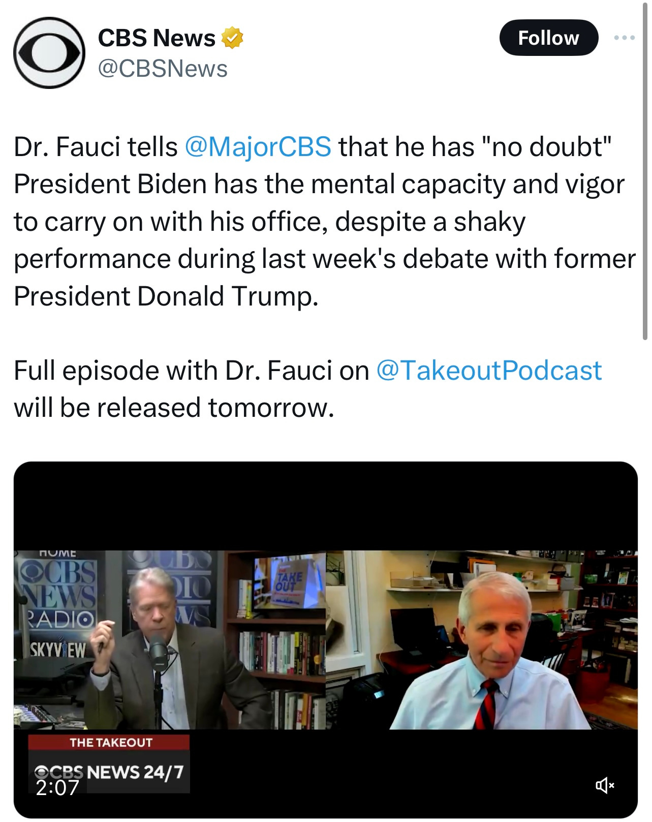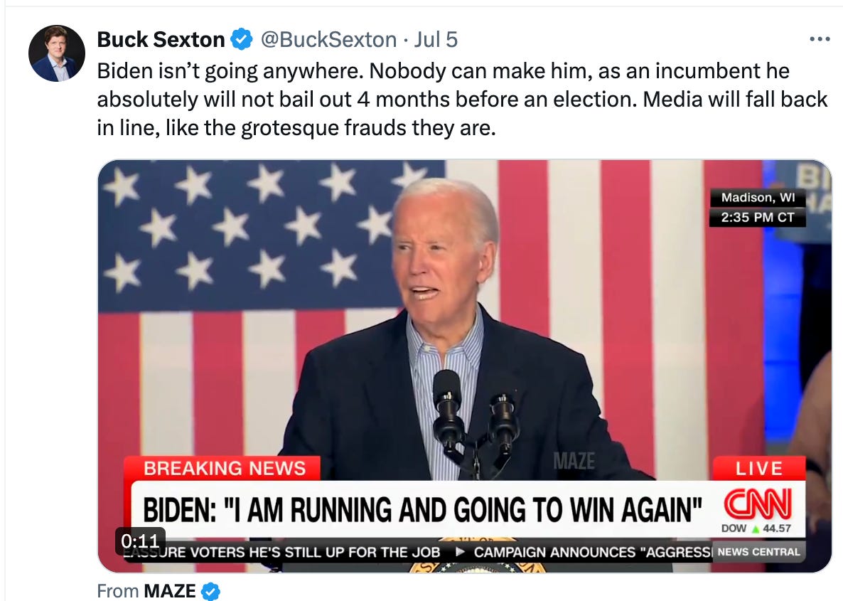 Make no mistake about it, the Biden campaign HAS collapsed in the wake of Thursday’s ‘debate’, even if – like the proverbial chicken with its head cut off – it continues to run around for a few weeks or months. At some point, whether from bad internal polls or donations drying up or the next inevitable gaffe or maybe even the November vote, the carcass falls to the ground. But the moment of death was 9:05pm EDT on Thursday, June 27th. That’s the moment where we all saw what we all saw, that Joe Biden is not mentally competent to be president of the United States.