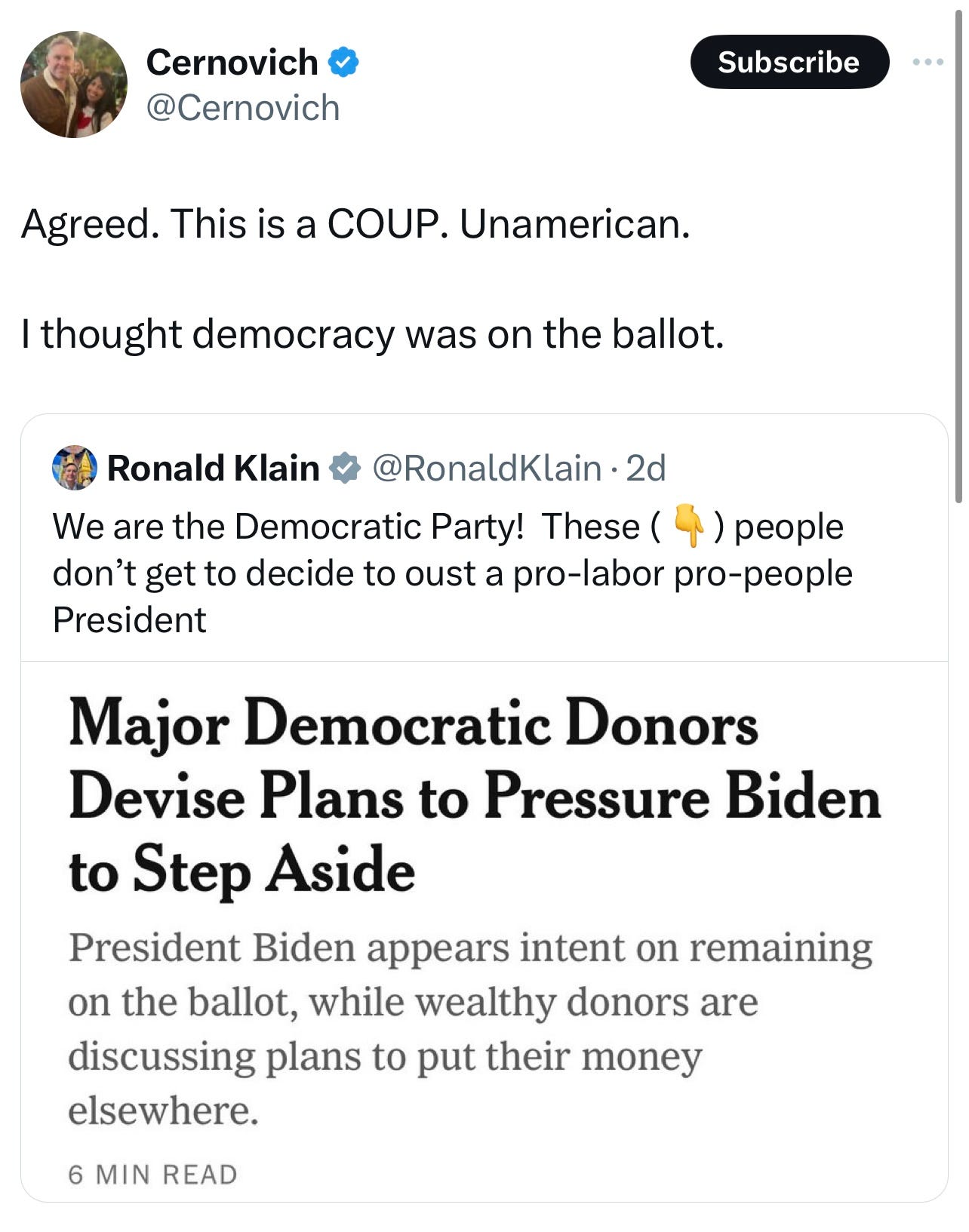 What’s playing out now is a good old fashioned palace coup, and only time will tell if Biden still has enough support from the inner sanctum and security state to run out the shot clock until the Convention.