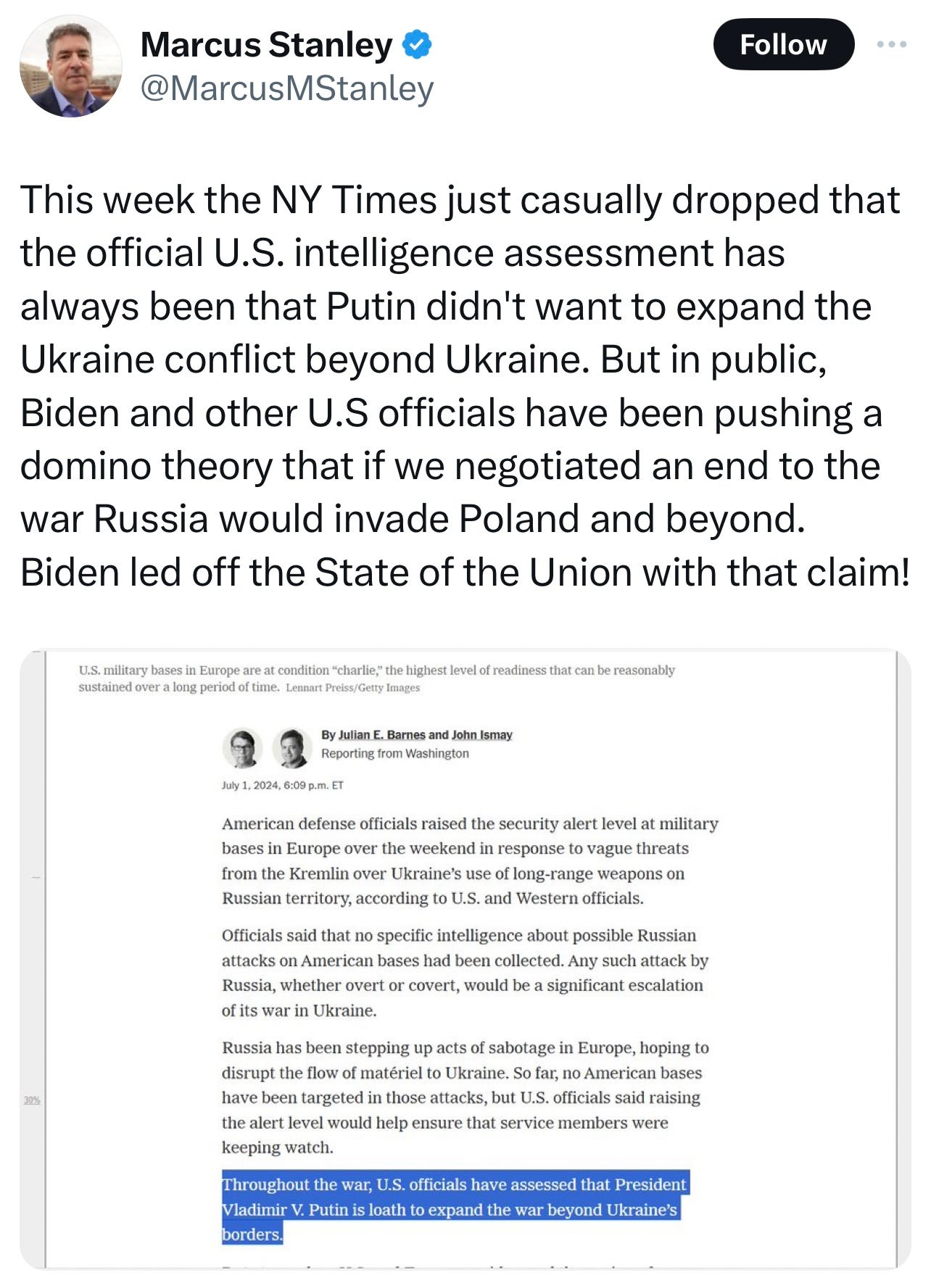 Expanded NATO, as if that’s something to brag about. Trying to expand NATO to Ukraine is the exact reason we are in a war in Ukraine.